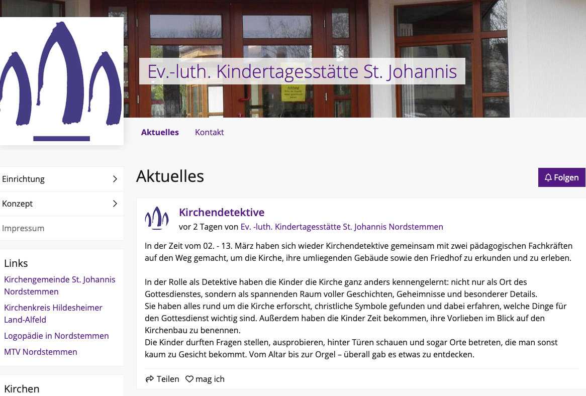 Die St. Johannis Kindertagesstätte in der Bonhoefferstraße informiert ab sofort über ihre Arbeit mit einer neuen Internetseite. Die im System „wir sind evangelisch“ der Landeskirche Hannovers gebaute Seite bietet Eiblicke in die Räume des Gebäudes, die Konzepte der Einrichtung und stellt das Team vor. Highlight der Seite sind aktuelle News zu Aktionen.